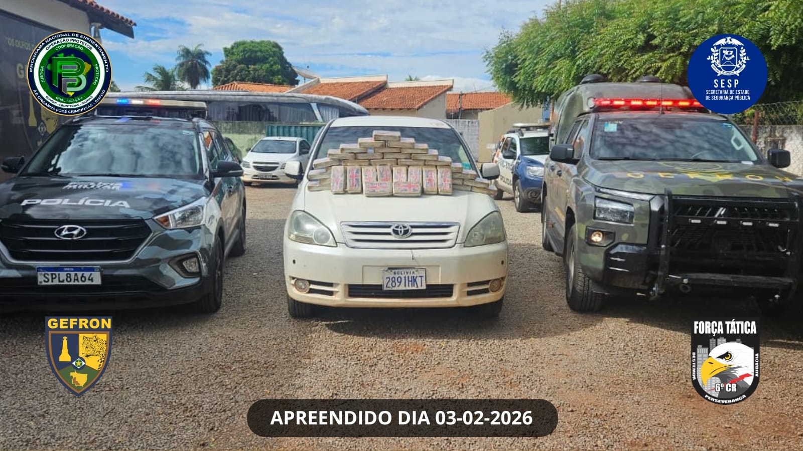 Durante a abordagem a um táxi boliviano, que seguia no sentido Bolívia–Brasil, os policiais localizaram um compartimento oculto no veículo, onde estavam escondidos 49 tabletes de substância análoga à pasta base de cocaína. O automóvel era ocupado por dois homens e uma mulher, todos com antecedentes criminais por tráfico de drogas.