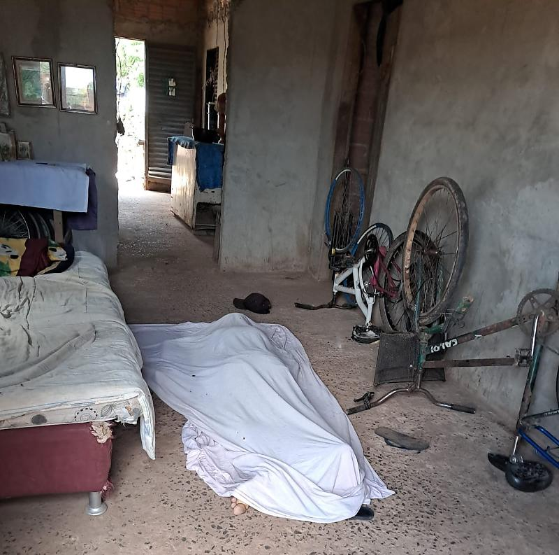A Polícia Militar foi acionada via CIOSP e, ao chegar à Rua Leblon, encontrou a vítima caída no cômodo da frente da casa, já sem sinais vitais, apresentando múltiplas perfurações por disparos de arma de fogo, principalmente na região do rosto.