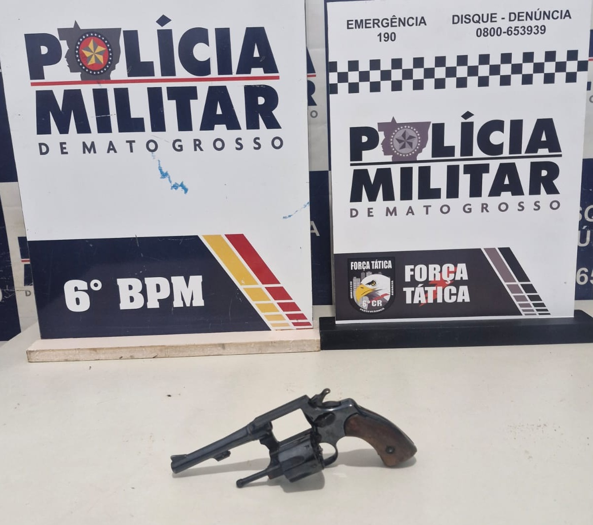 Durante as buscas no local, um revólver calibre .32, sem marca aparente, com numeração 360335 e sem munições, foi encontrado próximo ao muro por onde o suspeito teria tentado fugir.