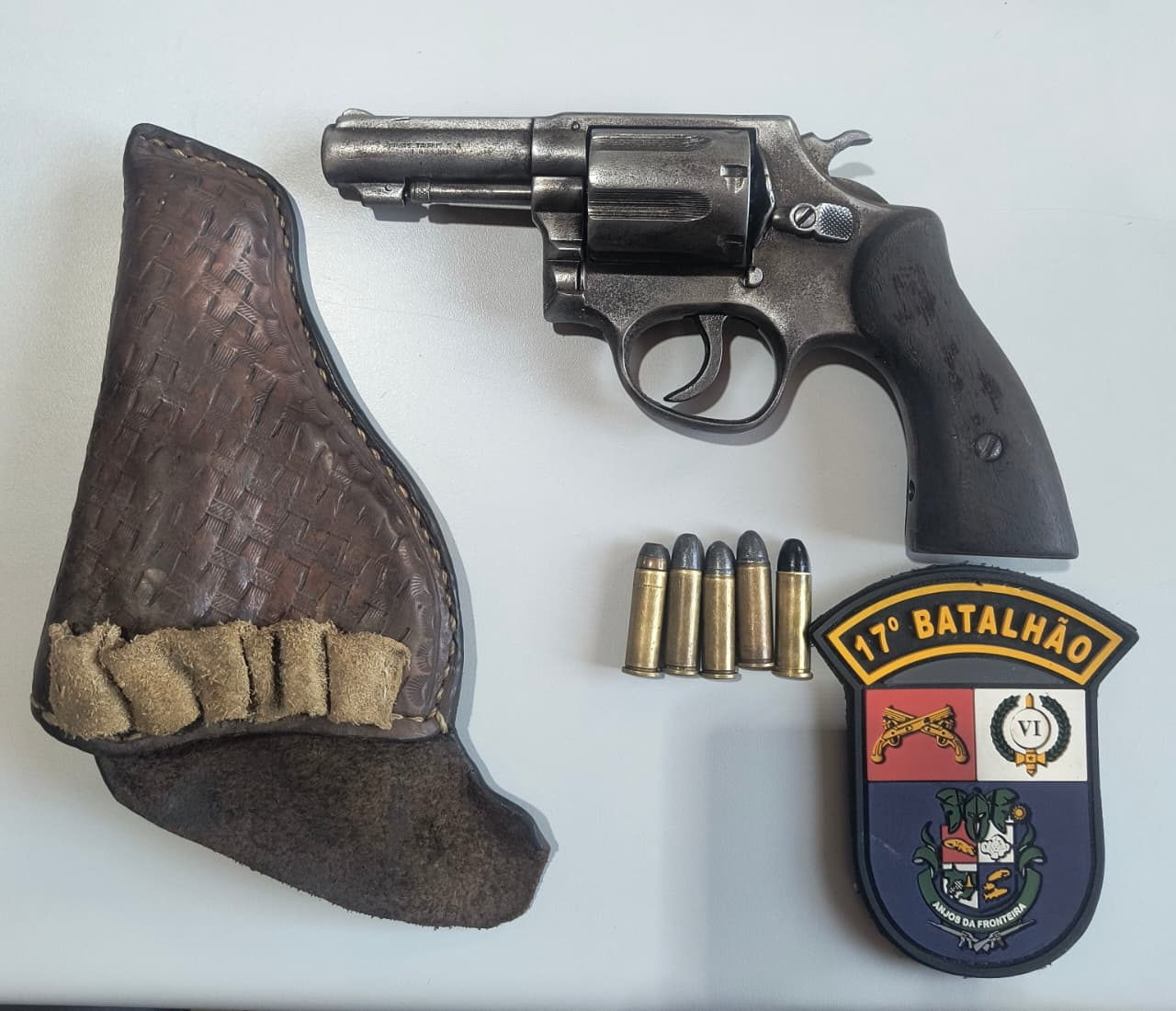 O homem foi abordado e, durante a revista pessoal, os militares localizaram um revólver Taurus calibre .38, municiado com cinco munições intactas. Questionado, o suspeito afirmou ser o proprietário da arma e declarou que teria sido contratado para fazer a segurança do dono da oficina, que estaria recebendo ameaças de morte supostamente de integrantes de uma facção criminosa.
