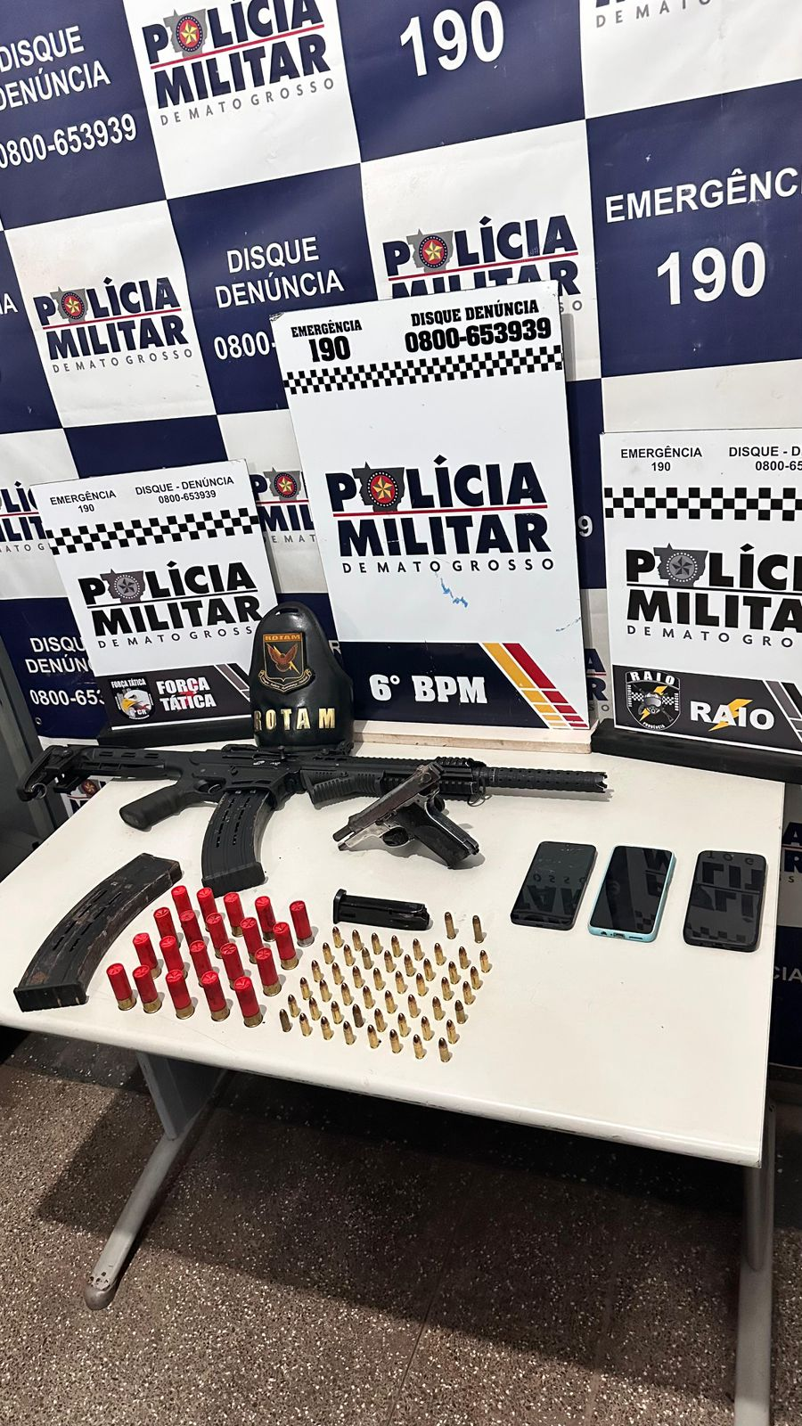 Ao chegarem ao local, vários suspeitos fugiram pulando muros e se escondendo em imóveis vizinhos. Durante o cerco policial, três homens foram localizados e detidos em residências próximas. Em um dos imóveis, foi encontrada uma espingarda calibre 12, que após checagem constatou-se ser produto de furto registrado no município de Sinop.