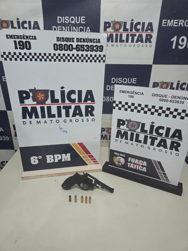 Durante o deslocamento, os policiais avistaram um homem e um menor saindo da região de mata em atitude suspeita. Na aproximação, foi possível observar o adulto dispensando um objeto por cima de uma cerca. Após a abordagem e buscas conjuntas com a Força Tática, os militares localizaram um revólver calibre .38, marca Taurus, com cinco munições, sendo duas percutidas e uma deflagrada.