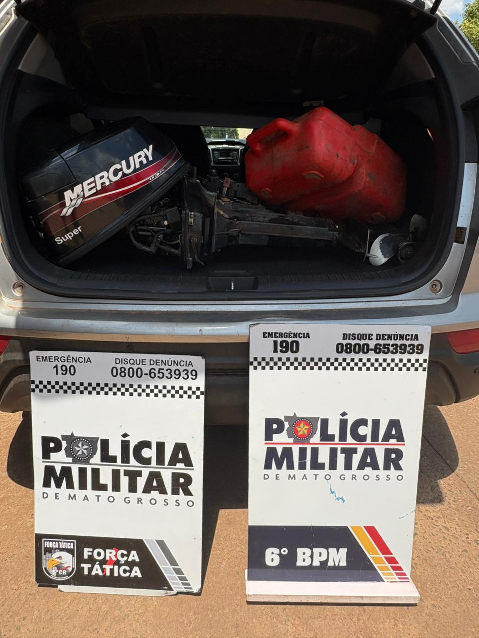 Ao chegar no local, os policiais não encontraram suspeitos, mas durante a varredura localizaram uma identidade e outros materiais. Entre os itens apreendidos estavam o veículo com placas duplicadas, um motor de barco, um tambor de combustível e documentos pessoais.